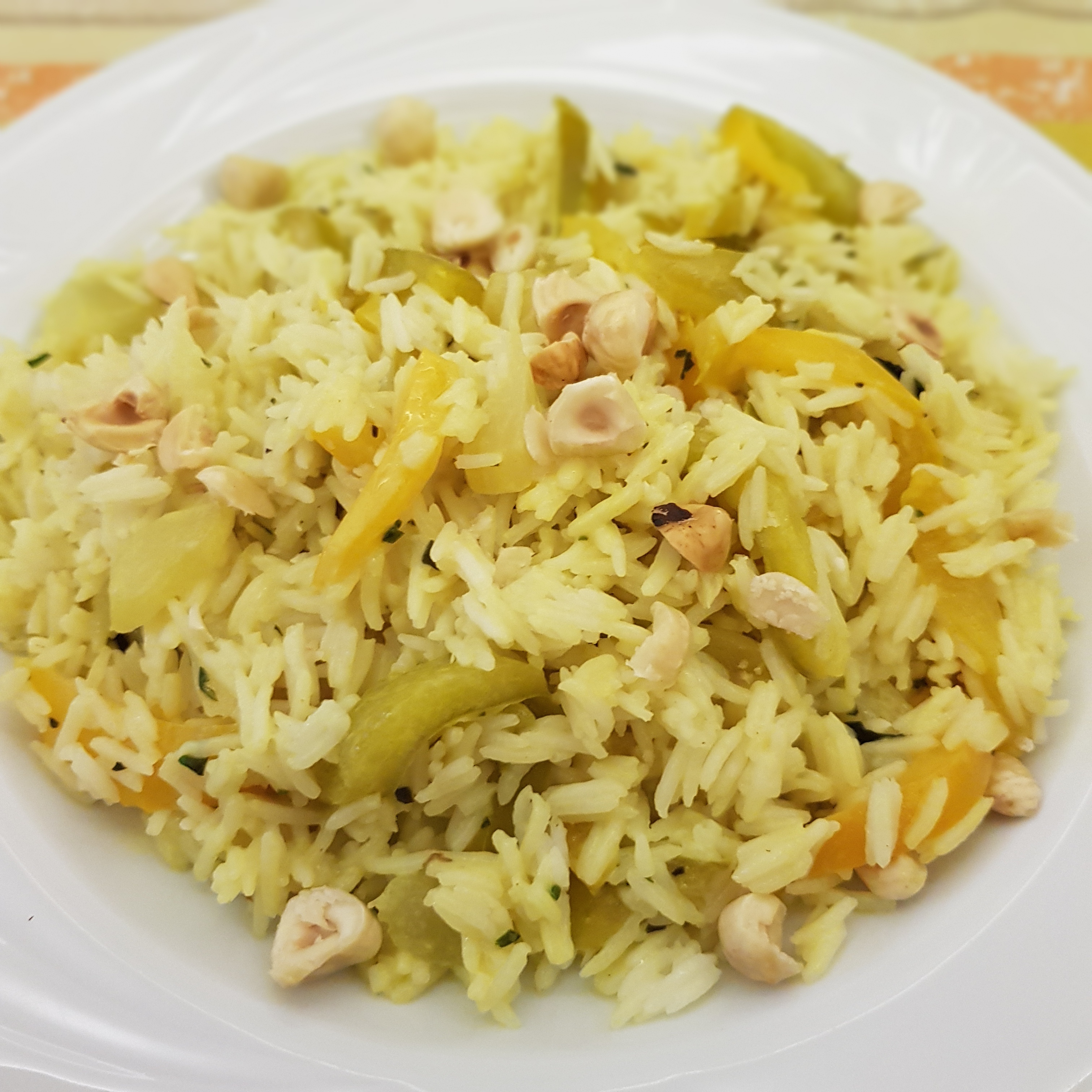 In foto qui: riso basmati cotto per assorbimento con peperoni gialli spadellati con basilico e nocciole per la nota croccante.