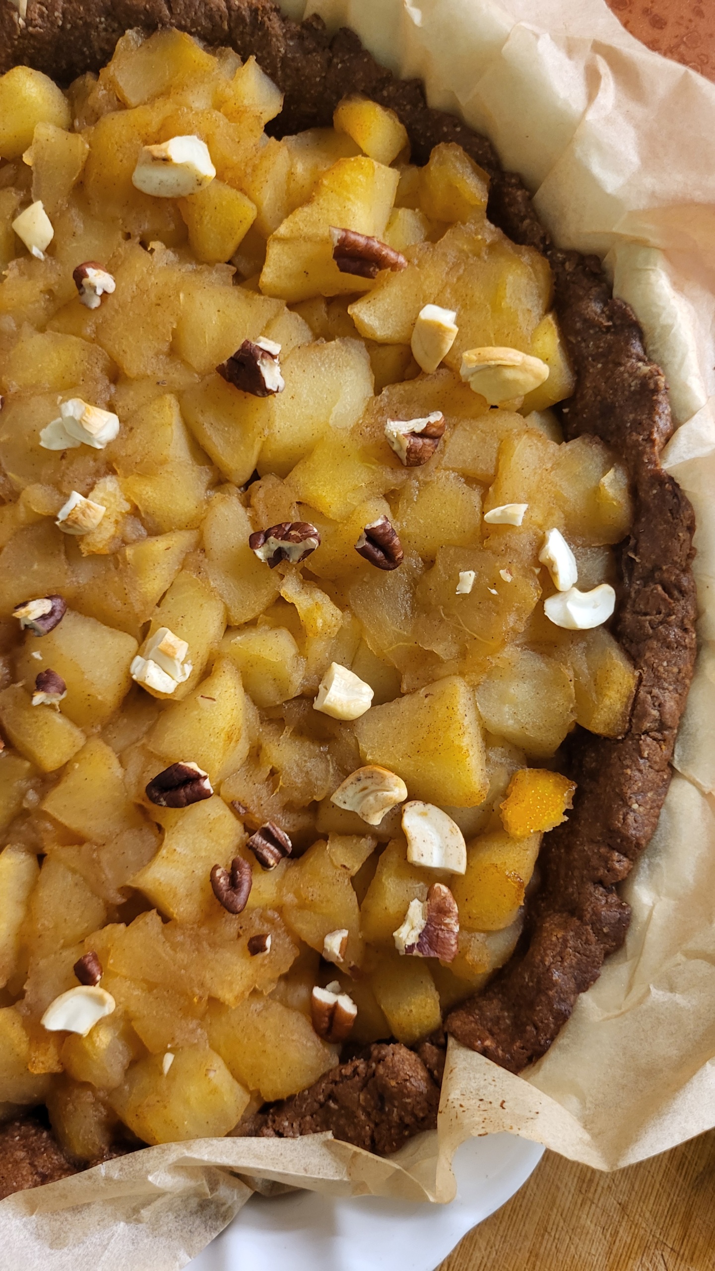 Tagliate i bordi della frolla, decorate con frutta secca e infornate per 40 minuti.