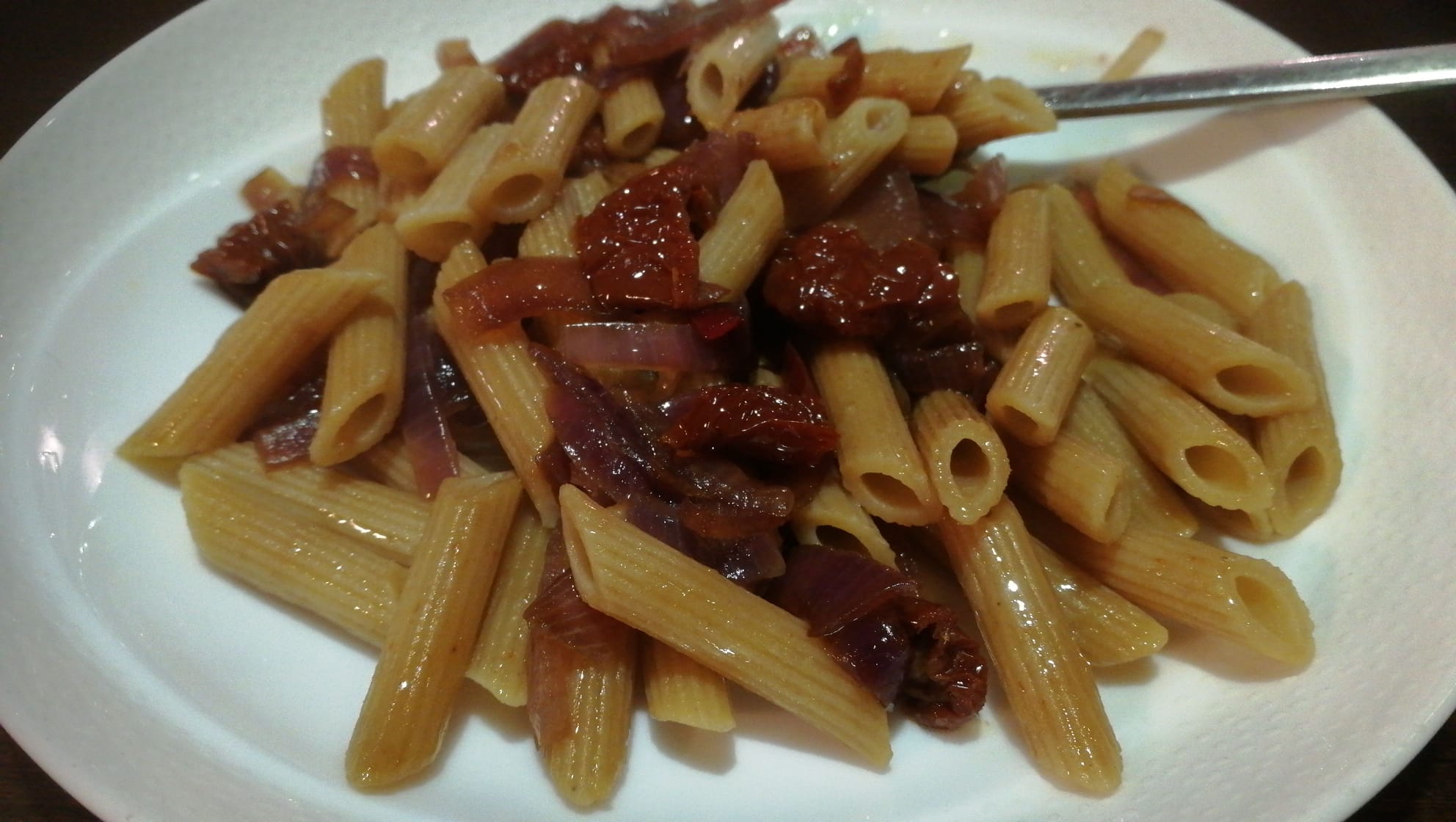 Pasta con cipolle, pomodori secchi e olive