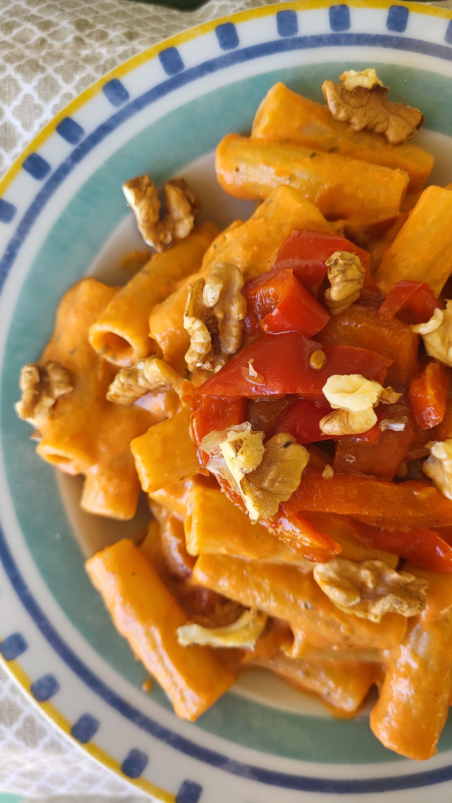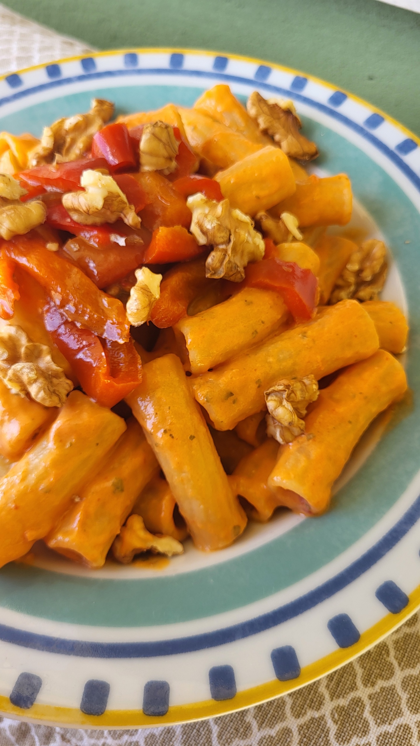 Quando la pasta sarร cotta, manteca con la crema, poi impiatta decorando con qualche peperone non frullato e noci sbriciolate.